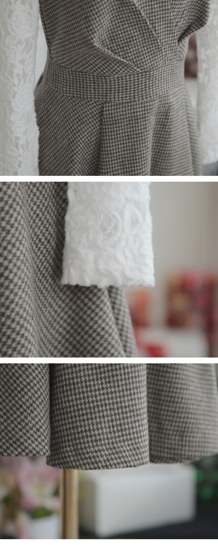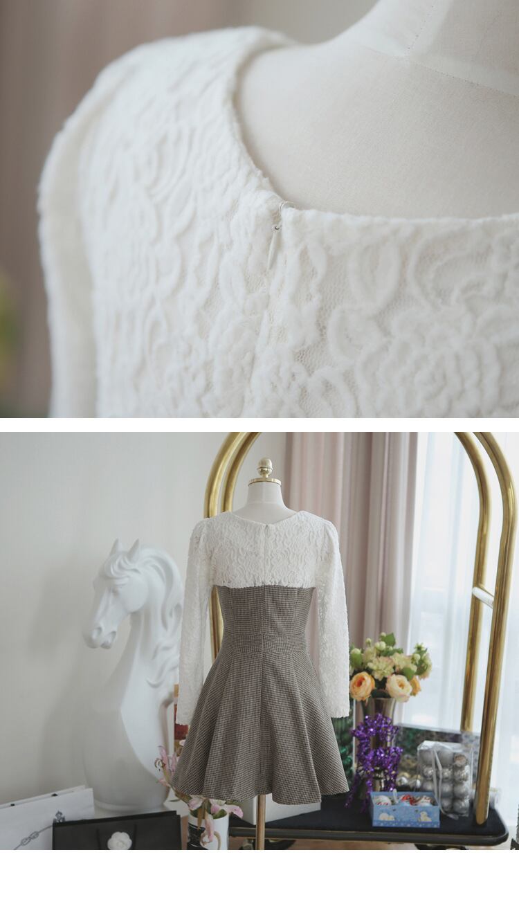 大人可愛い♪ ワンピース ウエストラインが美しい 上品 レース+千鳥格子 異素材
