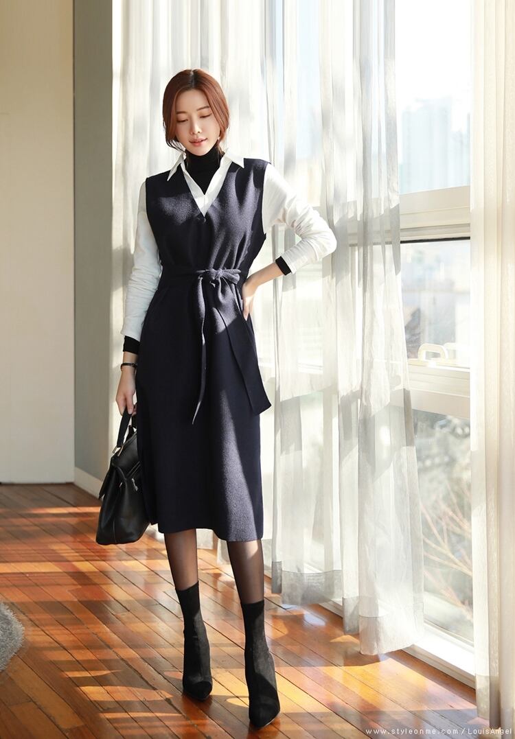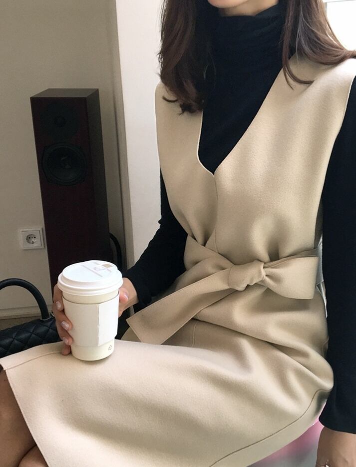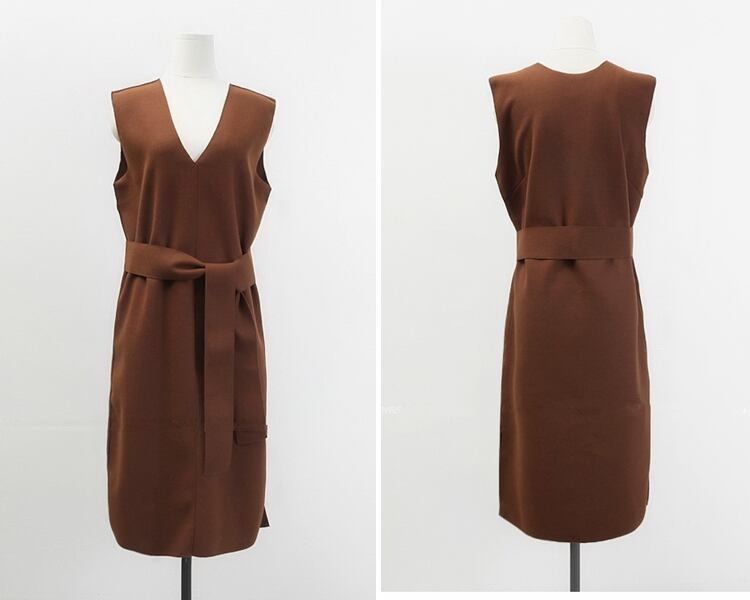 ノースリーブワンピース Vネック ウエストリボン スリット入り 無地 カジュアル