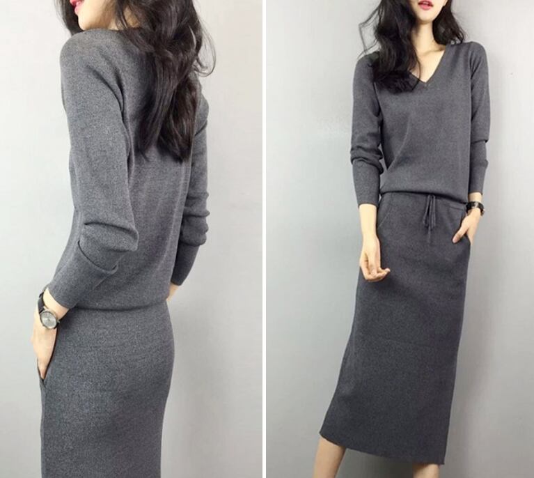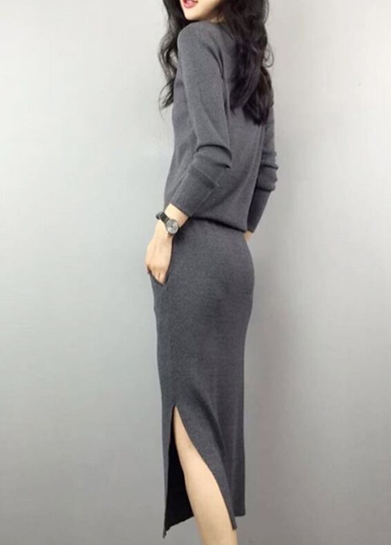 カジュアルロングワンピース Vネック スポーティー ウエストゴム スリット 無地